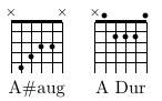 \begin{minipage}[b]{1pt} \chord{t}{x,p5,p4,p3,p3,x}{A\#{aug}} \end{minipage} \begin{minipage}[b]{1pt} \chord{t}{x,p0,p2,p2,p2,p0}{A Dur} \end{minipage}So sieht das Ergebnis aus.