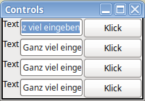 Der FlexGridSizer ordnet seine Elemente auch in einem Raster. Allerdings richtet sich die Größe der Spalten und Zeilen nach der von den Elementen benötigten Größe.wxControlFrame::wxControlFrame() : wxFrame((wxFrame *)0, -1, "Controls", wxPoint(50,50), wxSize(400,300)) { wxFlexGridSizer *flex = new wxFlexGridSizer(3); for (int i=0; i<4; i++) { flex->Add(new wxStaticText(this, i*3, "Text")); flex->Add(new wxTextCtrl(this, i*3+1, "Ganz viel eingeben")); flex->Add(new wxButton(this, i*3+2, "Klick")); } SetSizerAndFit(flex); }