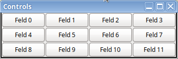 wxControlFrame::wxControlFrame() : wxFrame((wxFrame *)0, -1, "Controls", wxPoint(50,50), wxSize(400,300)) { wxGridSizer* grid = new wxGridSizer(4); for (int i=0; i<12; i++) { std::string str = "Feld "+std::to_string(i); grid->Add(new wxButton(this, i, str)); } SetSizerAndFit(grid); }
