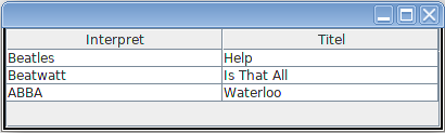 @Override public String getColumnName(int index) { // Die Spaltenueberschriften return index==0?"Interpret":"Titel"; } - Die Zeilenzahl wird durch die Methode getRowCount festgestellt.