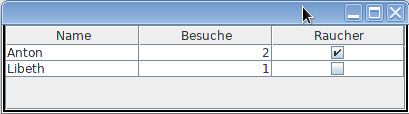 Wird für eine Spalte Integer.class zurückgegeben, wird die Spalte rechtsbündig ausgerichtet. Bei Boolean.class wird eine Checkbox angezeigt, mit einem Haken für true oder ohne Haken für false.