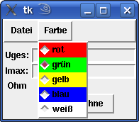 mfarbe = Menu(menubar, tearoff=0) # Die Radiobuttons füllen die Variable Uled Uled = DoubleVar() mfarbe.add_radiobutton(label="rot", variable=Uled,value=1.6, \ background="red") mfarbe.add_radiobutton(label="grün", variable=Uled,value=2.1, \ background="green") mfarbe.add_radiobutton(label="gelb", variable=Uled,value=2.2,\ background="yellow") mfarbe.add_radiobutton(label="blau", variable=Uled,value=2.9,\ background="blue") mfarbe.add_radiobutton(label="weiß", variable=Uled,value=4.0,\ background="white") menubar.add_cascade(label="Farbe", menu=mfarbe) # Das Menü wird eingehängt Fenster["menu"] = menubar # Nun kann das Programm laufen Fenster.mainloop()