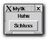 #!/usr/bin/python from Tkinter import * # Callback-Funktion für den Button def ende(): sys.exit(0) Fenster = Tk() meinLabel = Label(Fenster, text = "Huhu") meinButton = Button(Fenster, text = "Schluss", command = ende) meinLabel.pack() meinButton.pack() Fenster.mainloop()