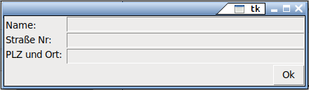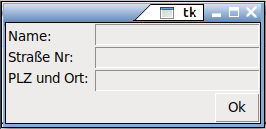 #!/usr/bin/python3 import sys import tkinter as tk def ende(): # Callback für den OK-Button sys.exit(0) # verlasse das Programm fenster = tk.Tk() # erstelle ein Hauptfenster # Baue einen Rahmen für die Eingabemaske ein rahmenMaske = tk.Frame(fenster) rahmenMaske.pack(expand=True, fill=tk.X) # Definiere in der Eingabemaske eine Spalte für Label und eine für Eingabe spalteLabel = tk.Frame(rahmenMaske) spalteLabel.pack(side=tk.LEFT) spalteEntry = tk.Frame(rahmenMaske) spalteEntry.pack(side=tk.LEFT, expand=True, fill=tk.X) # Beschriftung und Eingabe für den Namen nameLbl = tk.Label(spalteLabel, text = "Name: ") nameLbl.pack(anchor=tk.W) nameEntry = tk.Entry(spalteEntry) nameEntry.pack(fill=tk.X) # Beschriftung und Eingabe für die Strasse strasseLbl = tk.Label(spalteLabel, text = "Straße Nr: ") strasseLbl.pack(anchor=tk.W) strasseEntry = tk.Entry(spalteEntry) strasseEntry.pack(fill=tk.X) # Beschriftung und Eingabe für den Ort ortLbl = tk.Label(spalteLabel, text = "PLZ und Ort: ") ortLbl.pack() ortEntry = tk.Entry(spalteEntry) ortEntry.pack(fill=tk.X) # Der OK-Button klebt sich als Kind von fenster unter die Maske okBtn = tk.Button(fenster, text = "Ok", command=ende) okBtn.pack(anchor=tk.E) # rechts ausrichten fenster.mainloop()